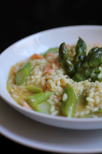 2. Numa panela, derreta  2 colheres (sopa) de manteiga juntamente com a cebola e deixe refogar por alguns instantes até que fiquem translúcidas. Adicione o arroz e refogue por mais alguns minutos, acrescente o vinho branco e não pare de mexer até que o vinho evapore. Vá adicionando uma concha de caldo por vez, mexendo sempre, lembre-se que você só deverá adicionar a seguinte concha de caldo após a anterior ter secado. Tempere com sal e pimenta. Prove o risotto. Quando os grãos estiverem "al dente", já é hora de desligar o fogo. Adicione os espargos, o salmão defumado e a restante da manteiga. Deixe descansar por 1 ou 2 minutos e sirva imediatamente.
